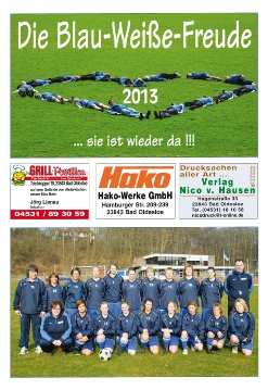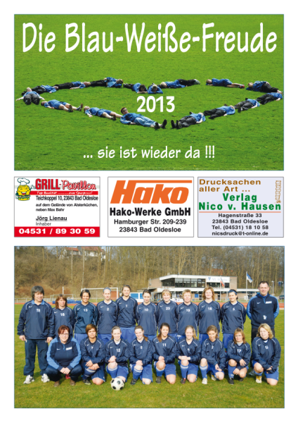 19.12.2012: Es ist eine schöne Tradition geworden. Zum Jahresende warten einige schon sehnsüchtig darauf und auch in diesem Jahr-pünktlich zu Weihnachten-hat Rainer Fischer wieder seinen Kalender für das nächste Jahr "Die Blau-weisse-Freude 2013" herausgebracht. Auf 12 Monatsblättern und einem, diesmal doppelseitigen, Rückblatt wird ein Querschnitt der Frauenmannschaft in Bildern gezeigt, aber auch der Nachwuchs ist im Jahr 2013 mit Bildern vertreten. |