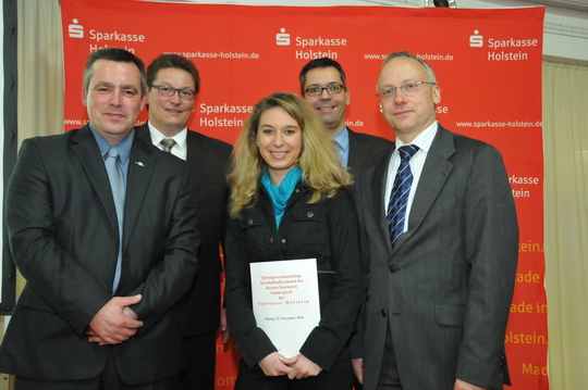 v.l.n.r. Jörg Lembke (Vorsitzender des Kreisfußballverbandes Stormarn), Detlef Rädisch (Ehrenamtbeauftragter des Kreisfußballverbandes Stormarn), Jessica Freelandt, Oliver Ruddigkeit (Leiter der Filiale der Sparkasse Holstein in Bad Oldesloe), Dr. Martin Lüdiger (Vorstandsvorsitzender der Sparkasse Holstein)